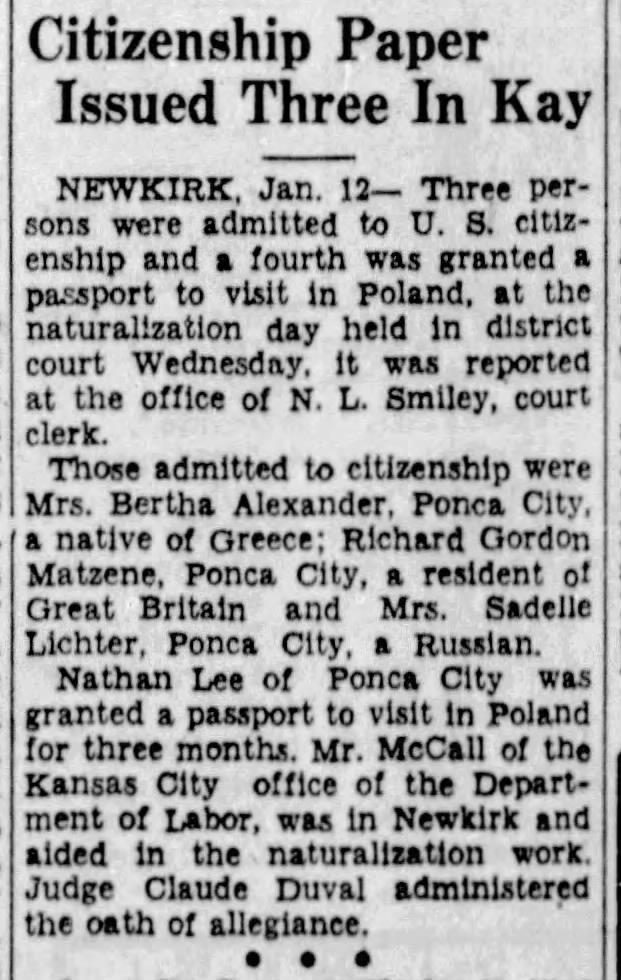 “Citizenship Paper Issued Three in Kay,” Blackwell Journal-Tribune (Blackwell, OK), January 13, 1939. [Page 5].