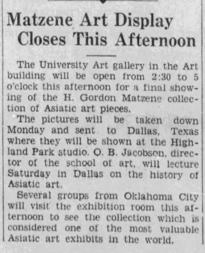 “Matzene Art Display Closes This Afternoon,” The Norman Transcript (Norman, OK), November 13, 1932. [Page 1].