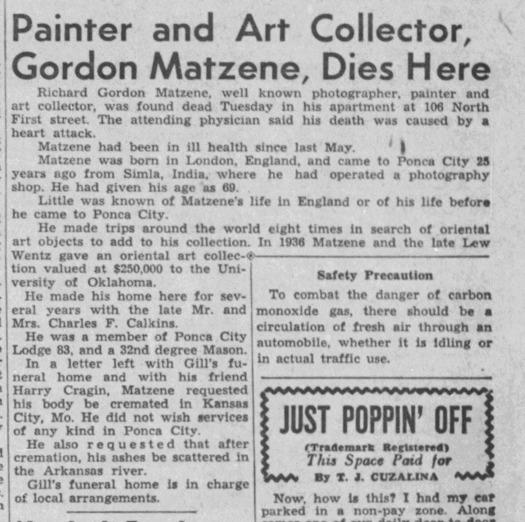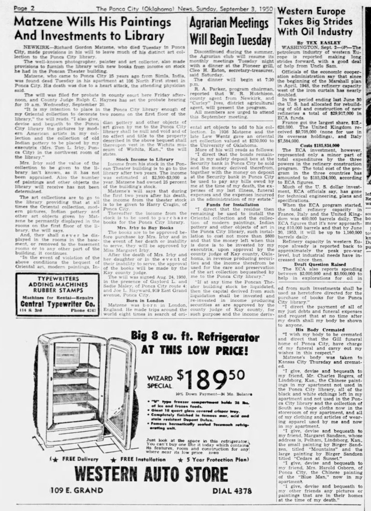 He stayed in Ponca City until his death on August 30, 1950. Richard Gordon Matzene donated a portion of his large collection to the Ponca City Library in the 1950s via his will. I have attached a newspaper article with specific details from Matzene’s will below!