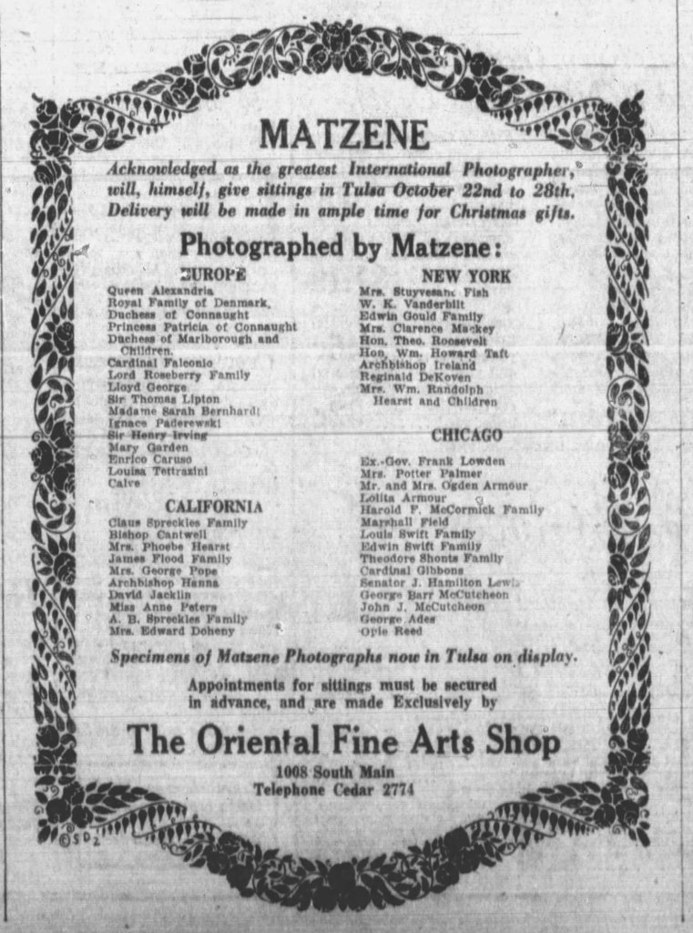 Matzene was kind of a local mystery in Ponca City, but he did well for himself through art brokerage and decorating services. He even photographed Native Americans during this time. According to the US Federal Census of 1930, Matzene was living in Ponca City, Oklahoma as a lodger in the home of Charles and Maud R. Calkins. He was 55 years old and still working as a photographer. He was widowed at this point in his life.