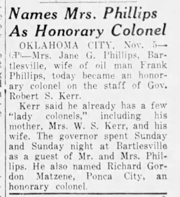 “Names Mrs. Phillips As Honorary Colonel,” Morning Examiner (Bartlesville, OK) November 6, 1945. [Page 1].