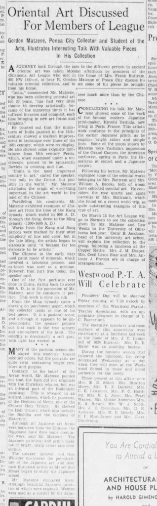 “Oriental Art Discussed For Members of League,” The Oklahoma News (Oklahoma City, OK), February 9, 1937. [Page 7].