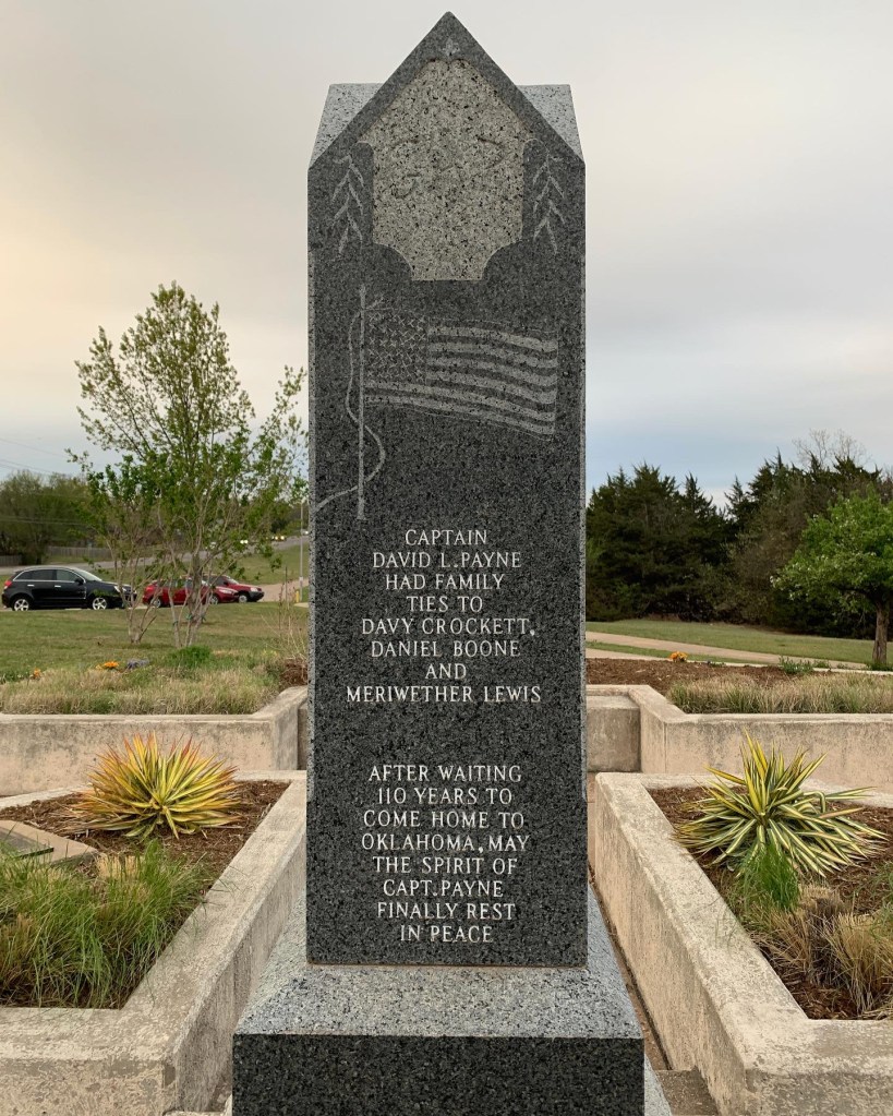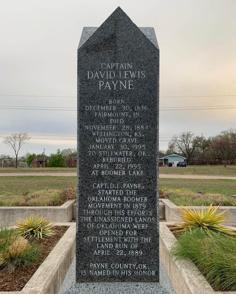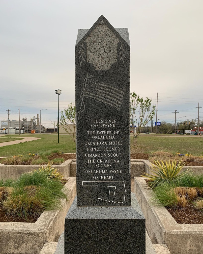 Monument for Capt. David L. Payne. He was responsible for the Oklahoma Boomer movement in 1879 which eventually led to the Land Run on April 22, 1889 for the “Unassigned Lands.” Did you know Payne County in Oklahoma was named for him?