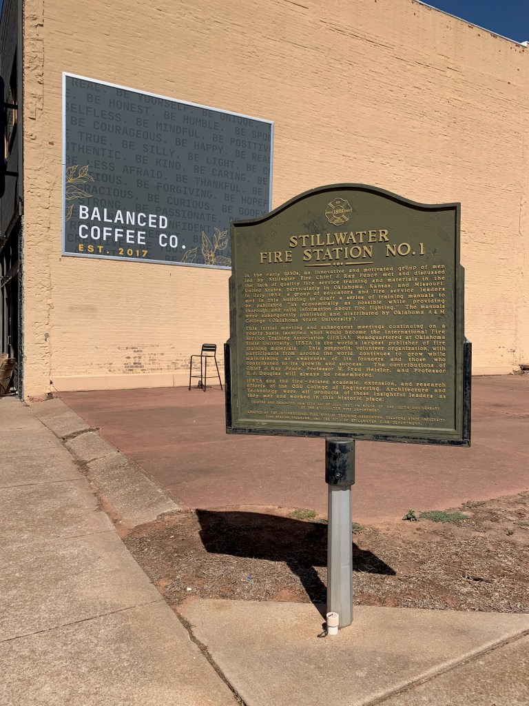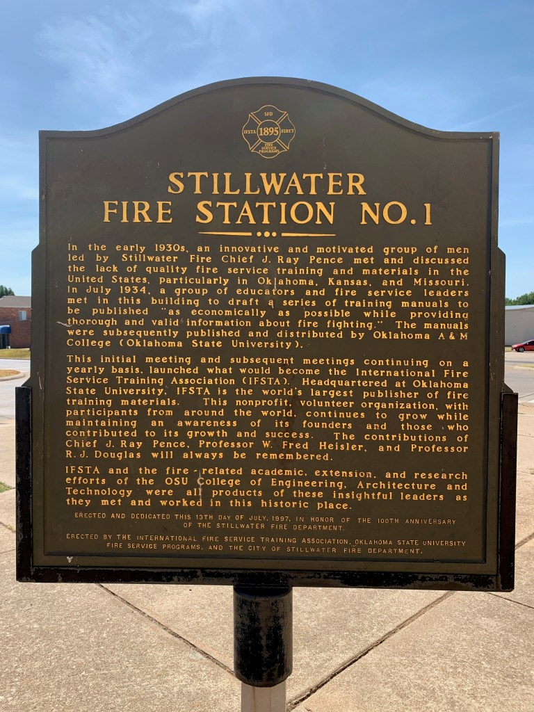 “In the early 1930s, an innovative and motivated group of men led by Stillwater Fire Chief J. Ray Pence met and discussed the lack of quality fire service training and materials in the United States, particularly in Oklahoma, Kansas, and Missouri. In July 1934, a group of educators and fire service leaders met in this building to draft a series of training manuals to be published ‘as economically as possible while providing thorough and valid information about fire fighting.’ The manuals were subsequently published and distributed by Oklahoma A & M College (Oklahoma State University).”