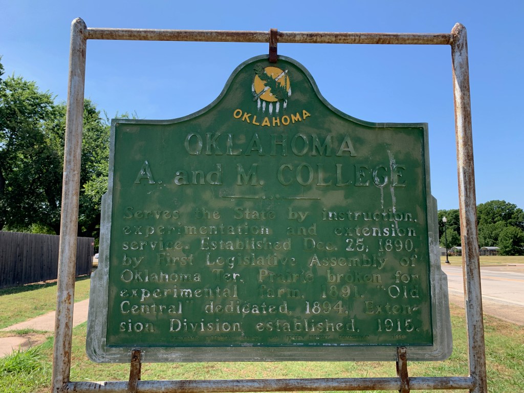 “Serves the State by instruction, experimentation and extension service. Established Dec. 25, 1890, by First Legislative Assembly of Oklahoma Ter. Prairie broken for experimental farm, 1891. ‘Old Central’ dedicated, 1894. Extension division established, 1915.” (Oklahoma A and M College Historical Marker Sign)