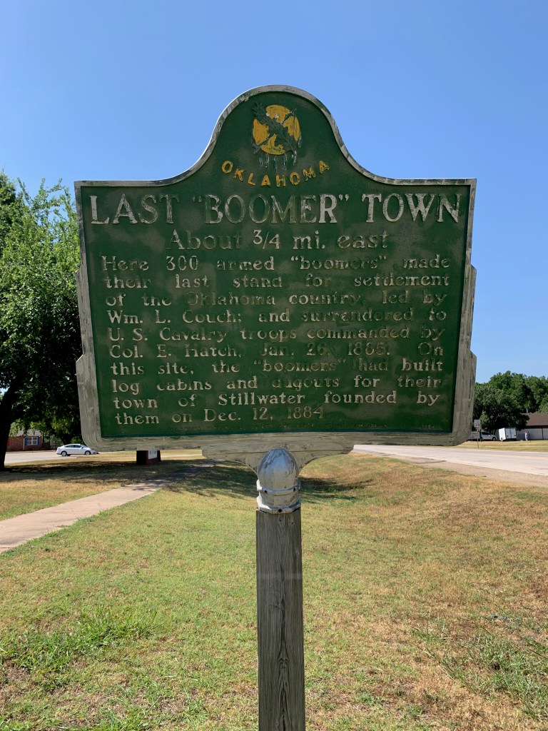 “Here 300 armed ‘boomers’ made their last stand for settlement of the Oklahoma country led by Wm. L. Couch; and surrendered to U.S. Cavalry troops commanded by Col. E. Hatch, Jan. 26, 1885. On this site, the ‘boomers’ had built log cabins and dugouts for their town of Stillwater founded by them on Dec. 12, 1884.” (Last “Boomer” Town Historical Marker Sign)
