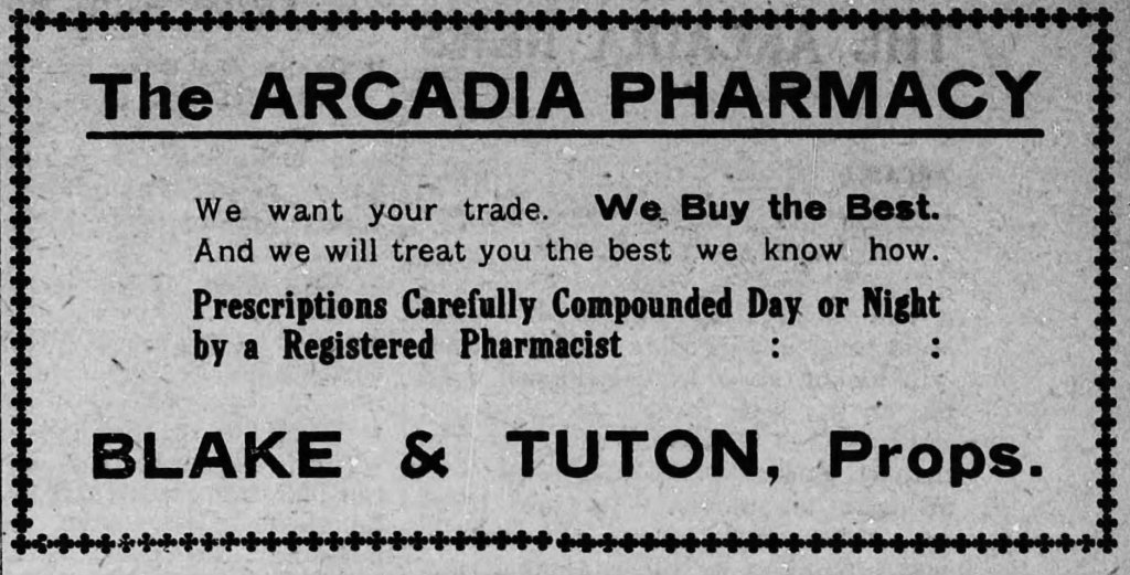 Below are some 1909 newspaper clippings that talk about previous locations of The Arcadia Pharmacy buildings. I would imagine the Blake and Tuton Pharmacy would have looked similar on the inside!