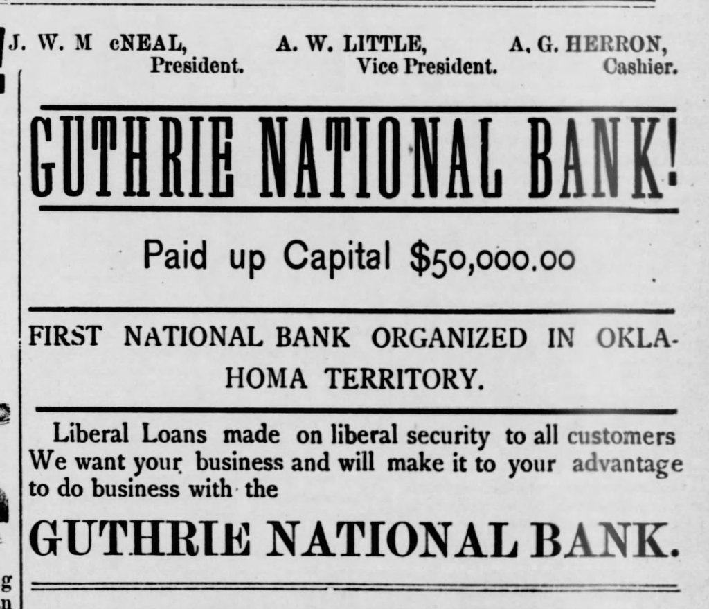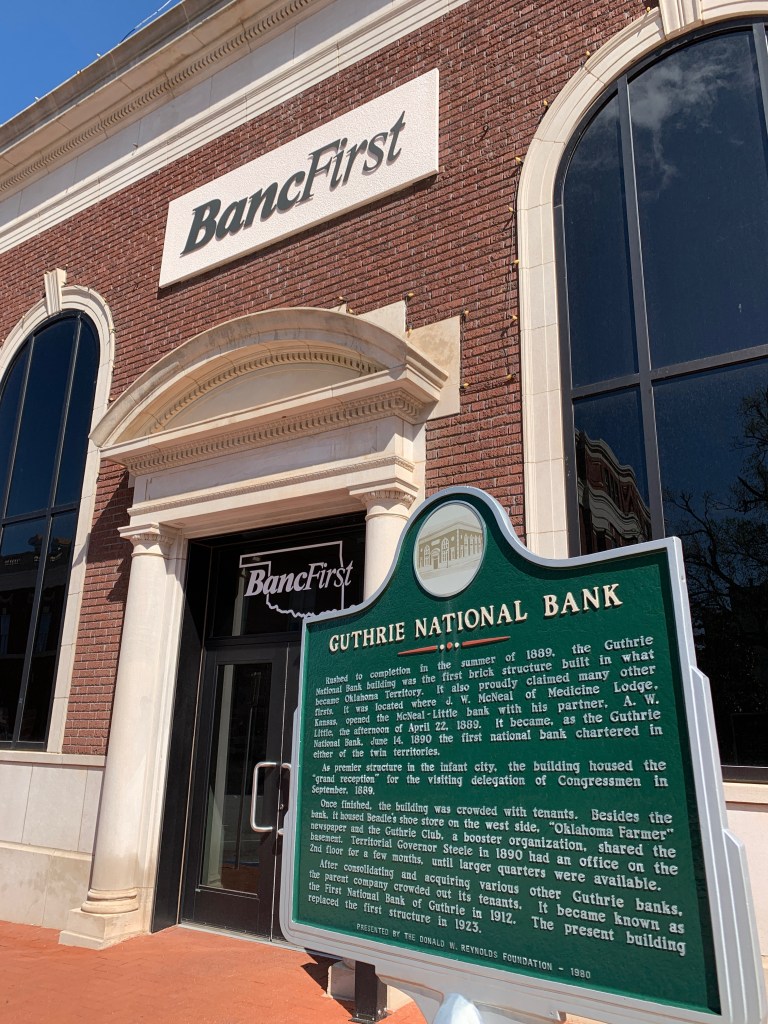 “Rushed to completion in the summer of 1889, the Guthrie National Bank building was the first brick structure built in what became Oklahoma Territory. It also proudly claimed many other firsts. It was located where J.W. McNeal of Medicine Lodge, Kansas, opened the McNeal-Little bank with his partner, A.W. Little, the afternoon of April 22, 1889. It became, as the Guthrie National Bank, June 14, 1890 the first national bank chartered in either of the twin territories.” (Guthrie National Bank Historic Marker)