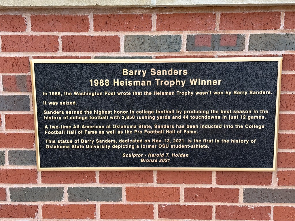 “In 1988, the Washington Post wrote that the Heisman Trophy wasn’t won by Barry Sanders. It was seized. Sanders earned the highest honor in college football by producing the best season in the history of college football with 2,850 rushing yards and 44 touchdowns in just 12 games. A two-time All-American at Oklahoma State, Sanders has been inducted into the College Football Hall of Fame as well as the Pro Football Hall of Fame. This statue of Barry Sanders, dedicated on Nov. 13, 2021, is the first in the history of Oklahoma State University depicting a former OSU student-athlete.”