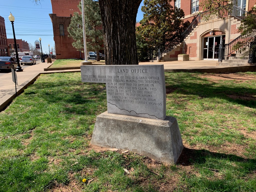 “This stone marks the site of the U.S. Land Office where each of 20,000 persons making the ‘historic run of 1889’ had to appear in person and file his claim. This also is the site of the first post office in old Oklahoma.”