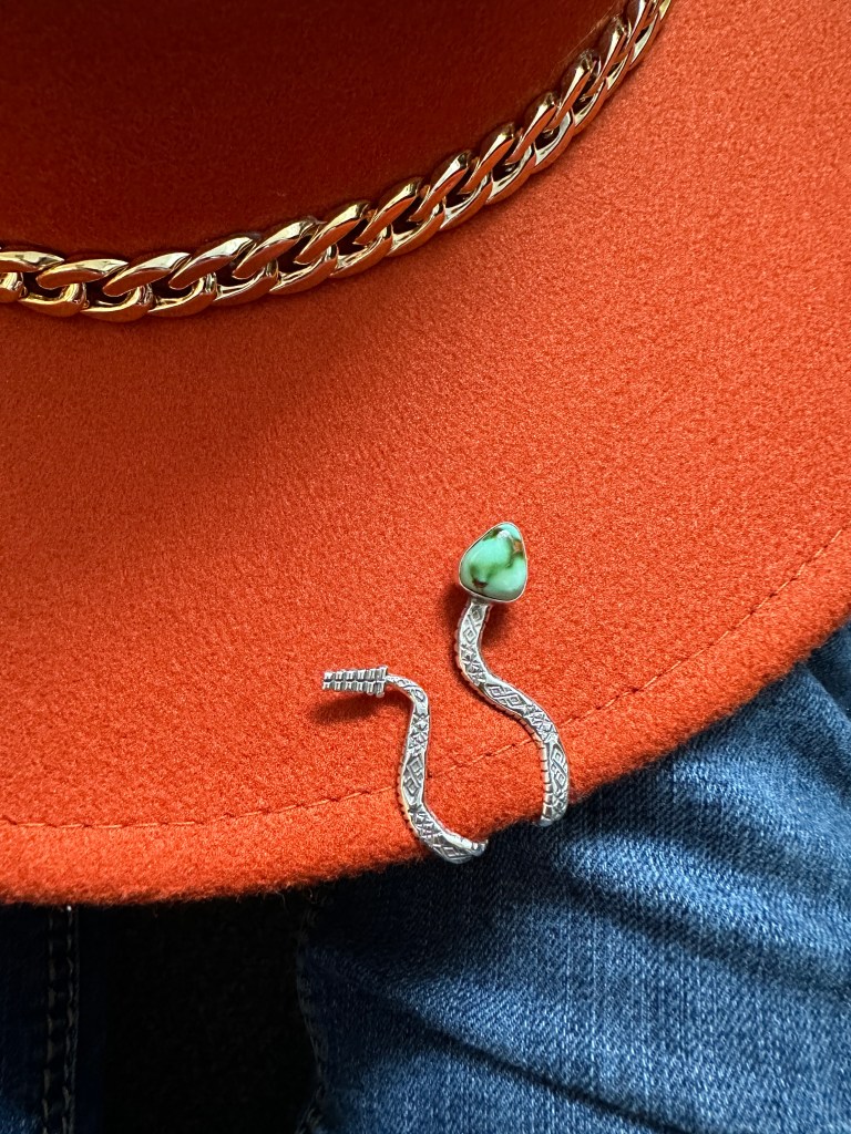 I told Matthew that I wanted something that would pop against the orange hat, but could also match my black felt cowboy hat. He suggested a Royston “Brim Biter.” I LOVE IT! The craftsmanship and attention to detail is amazing – I highly recommend his work.