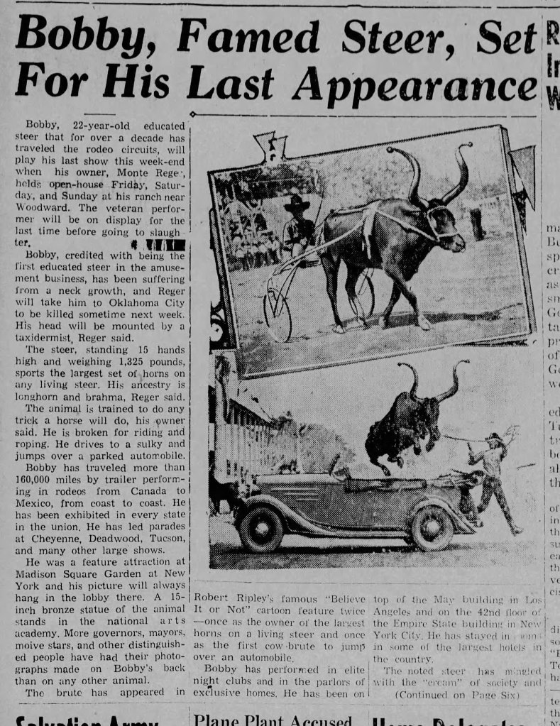 “Bobby, Famed Steer, Set For His Last Appearance.” Woodward Daily Press (Woodward, Oklahoma) December 9, 1943.