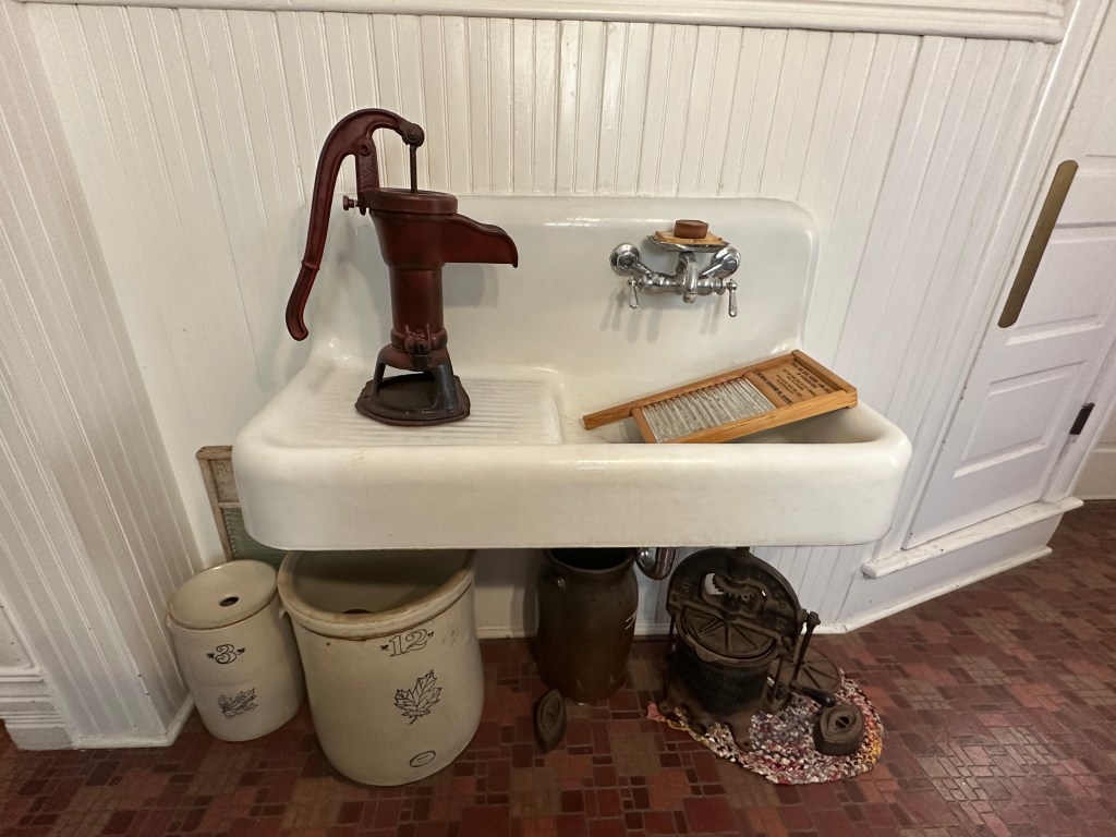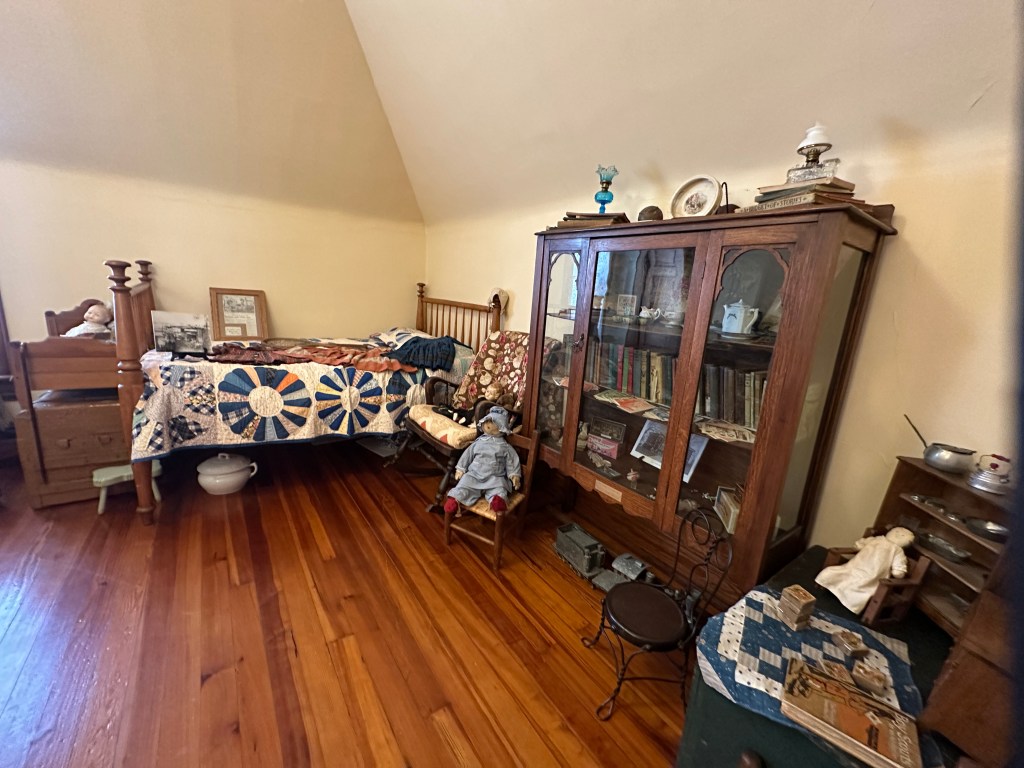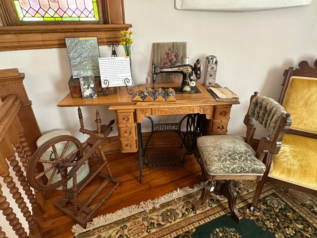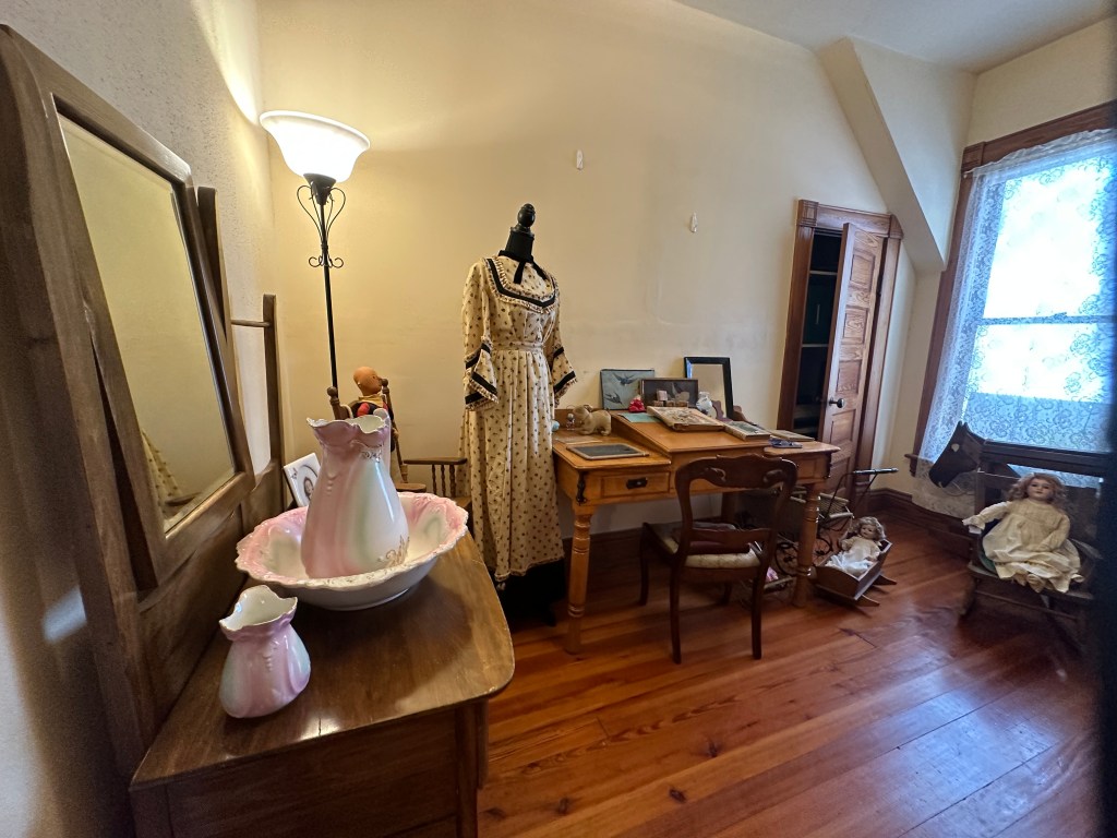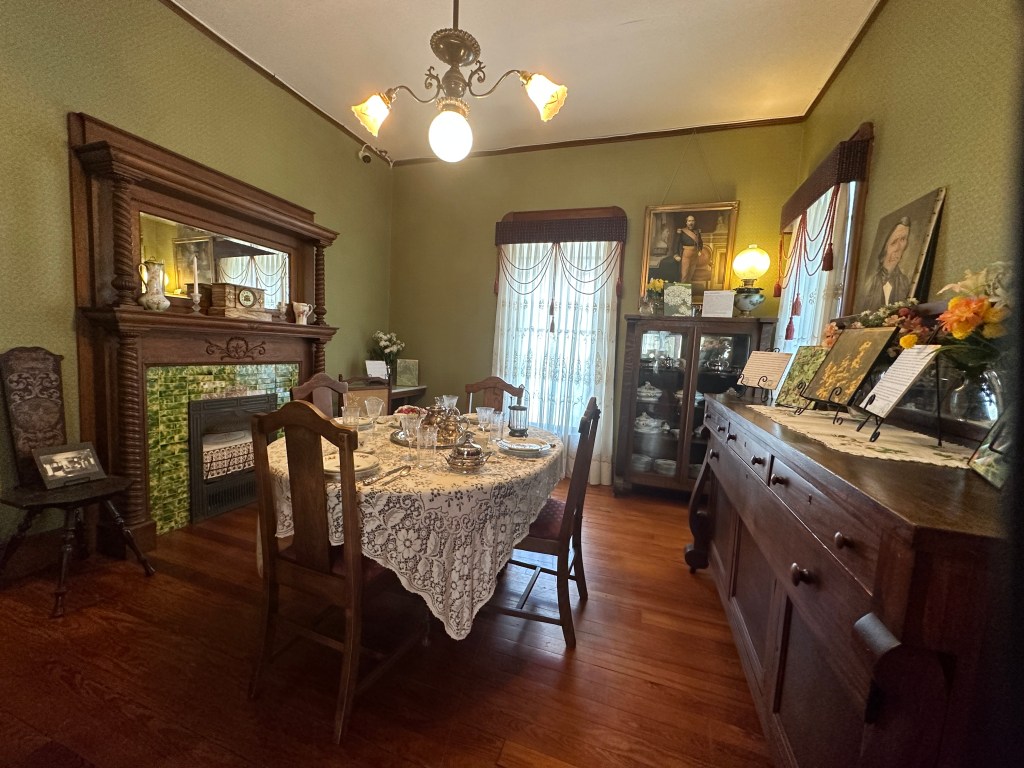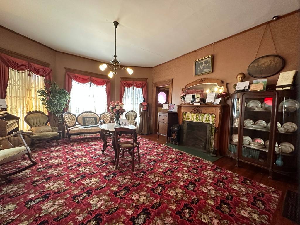 The Moore-Lindsay home covers approximately 2000 square feet over two stories. The first floor contains the entry hall, formal parlor, informal parlor, dining room, butler’s pantry, bathroom, kitchen, and former summer kitchen (now the museum office). The second floor contains the primary bedroom, children’s bedroom, and two former bedrooms that have been converted into an activity room and archives storage room. Additionally, there is a carriage house out back.