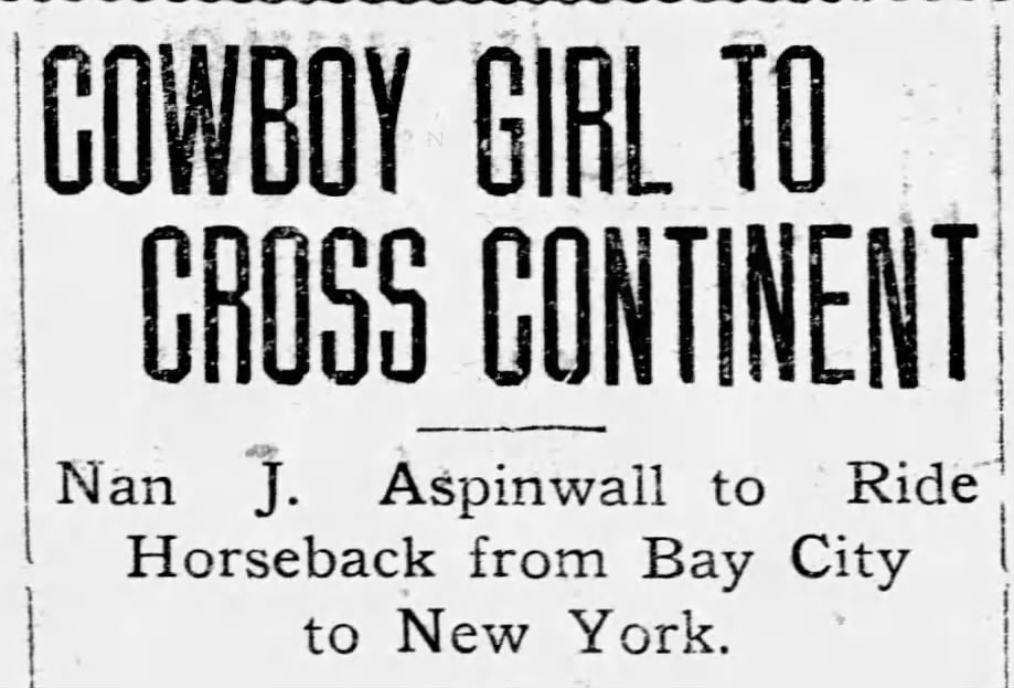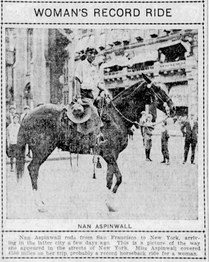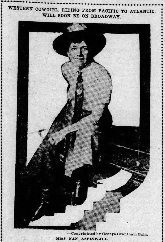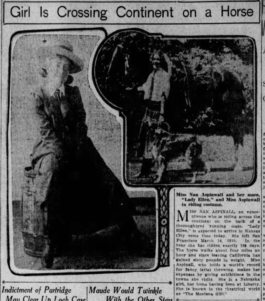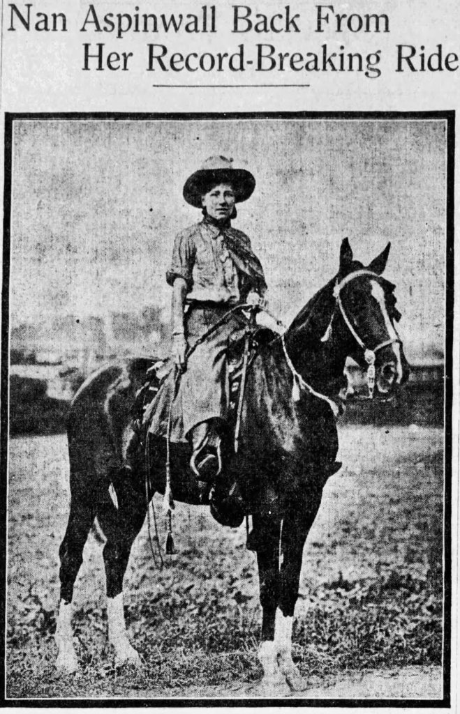 “Nan J. Aspinwall, the Girl Who Took a 5,000 Mile Horseback Ride.” Fremont Tribune (Fremont, Nebraska), November 16, 1911.
