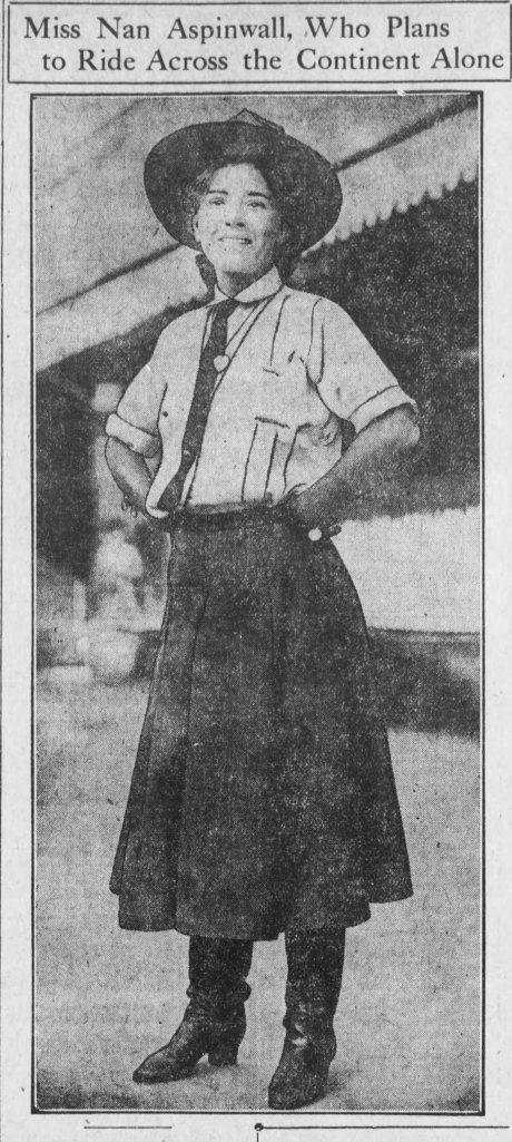 “Miss Nan Aspinwall, Who Plans to Ride Across the Continent Alone.” Los Angeles Herald (Los Angeles, California), July 9, 1910.