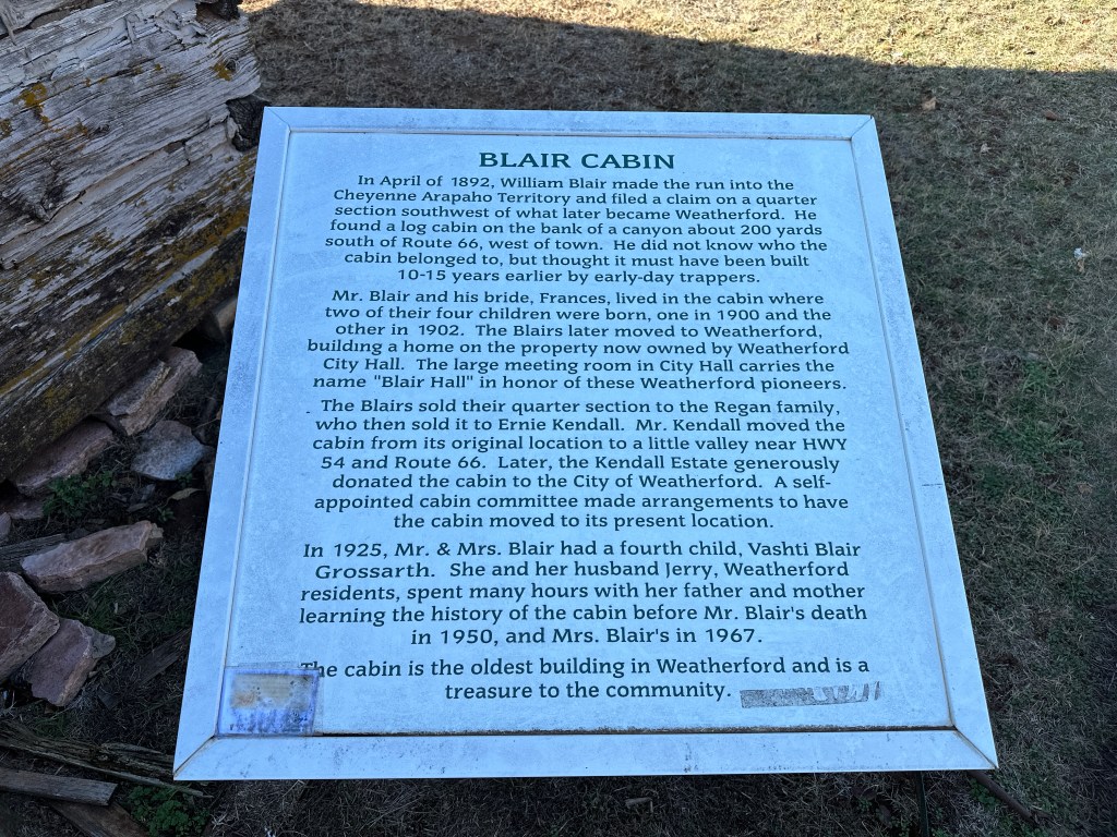 “In April of 1892, William Blair made the run into the Cheyenne Arapaho Territory and filed a claim on a quarter section southwest of what later became Weatherford. He found a log cabin on the bank of a canyon about 200 yards south of Route 66, west of town. He did not know who the cabin belonged to, but thought it must have been built 10-15 years earlier by early-day trappers.