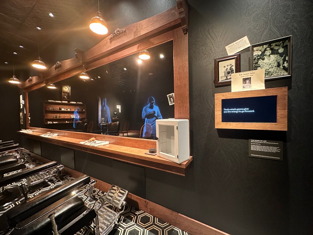 The barbershop was very cool in my opinion. The barbers are holograms that have conversation. They talk about the people who lived in Greenwood. The small box off to the side allows visitors to read along with the script which allowed for greater accessibility of the content.