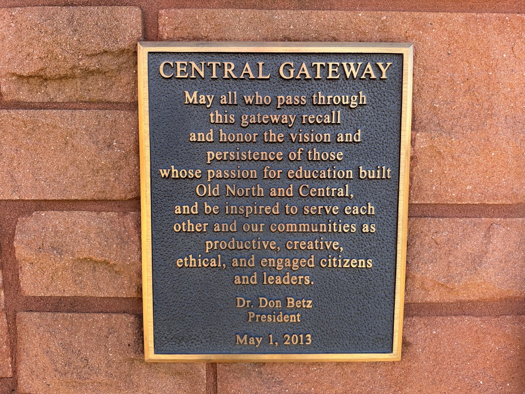 This plaque so inscribed on behalf of the honorable David Hall, Governor of Oklahoma, and Garland A. Godfrey, President, O.S.U., on November 9, 1972, by the Old North Memorial Committee: Alvin Alcorn, Bill Burghardt, Reba Collins, Stan Haig, and Joe G. Jackson.”