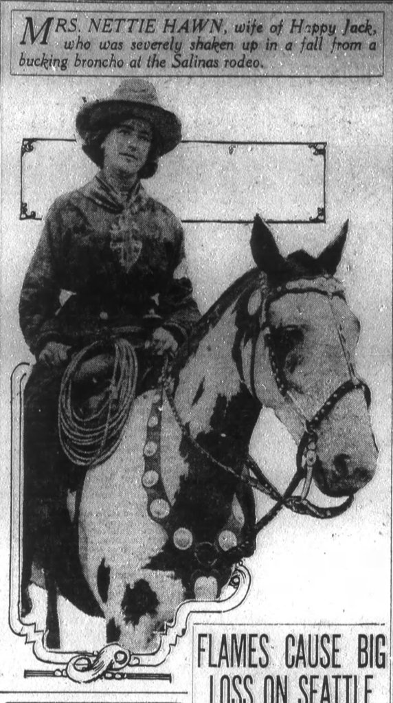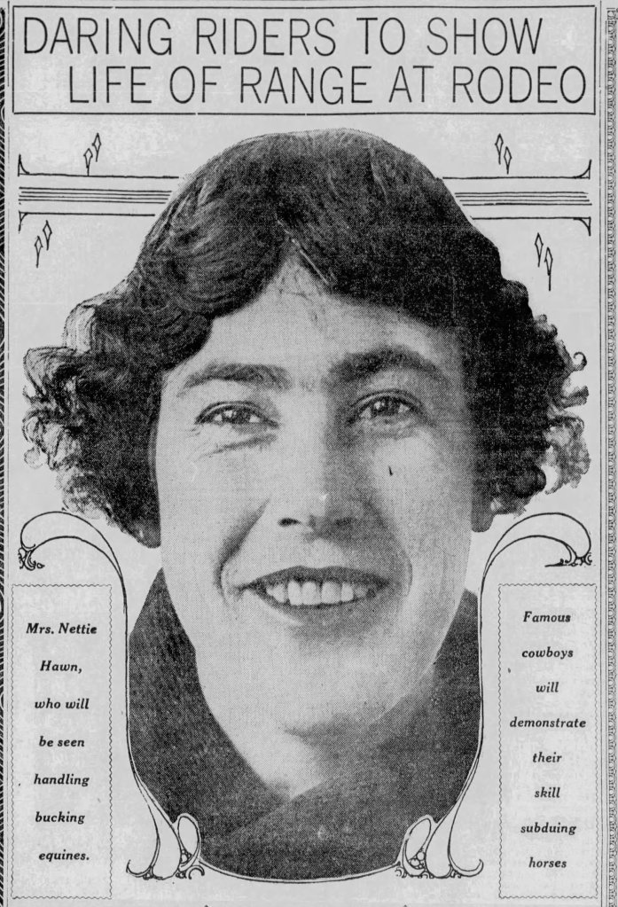 In October 1913, Nettie Hawn competed at the Emeryville racetrack. She “thrilled the crowd with an exhibition of bucking horse riding.” (“2 Cow Punchers Hurt At Rodeo.” The San Francisco Call and Post. October 8, 1913.)