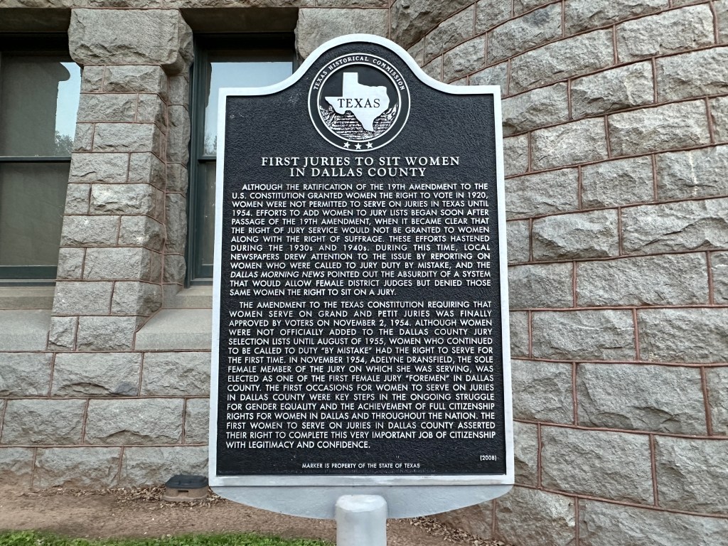 “Although the ratification of the 19th Amendment to the U.S. Constitution granted women the right to vote in 1920, women were not permitted to serve on juries in Texas until 1954. Efforts to add women to jury lists began soon after passage of the 19th Amendment, when it became clear that the right of jury service would not be granted to women along with the right of suffrage. These efforts hastened during the 1930s and 1940s. During the time, local newspapers drew attention to the issue by reporting on women who were called to jury duty by mistake, and the Dallas Morning News pointed out the absurdity of a system that would allow female district judges but denied those same women the right to sit on a jury.