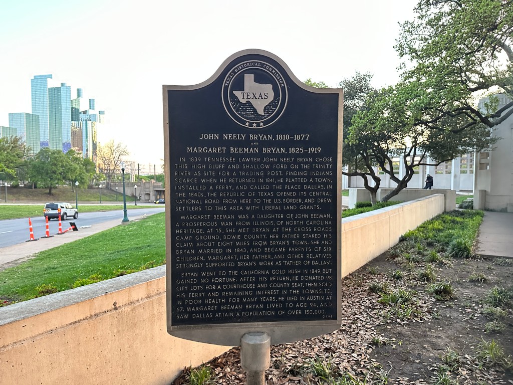 “In 1839 Tennessee Lawyer John Neely Bryan chose this high bluff and shallow ford on the Trinity River as site for a trading post, finding Indians scarce when he returned in 1841, he platted a town, installed a ferry, and called the place Dallas. In the 1840s, the republic of Texas opened its central national road from here to the U.S. border, and drew settlers to this area with liberal land grants.