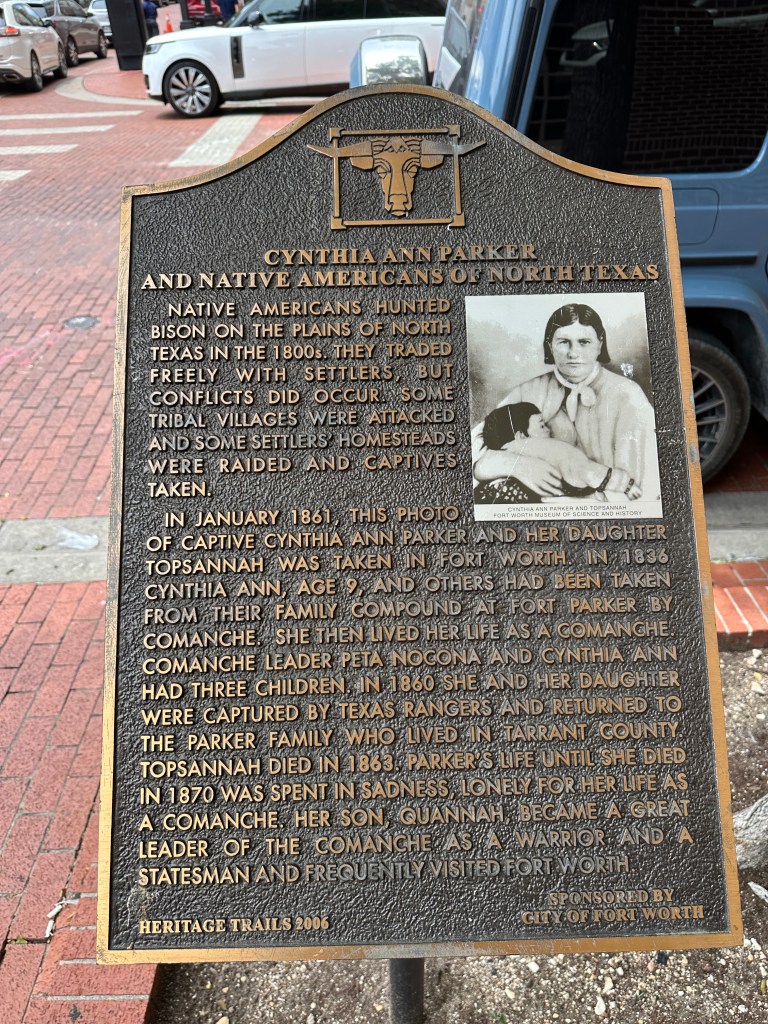 In January 1861, this photo of captive Cynthia Ann Parker and her daughter Topsannah was taken in Fort Worth. In 1836 Cynthia Ann, age 9, and others had been taken from their family compound at Fort Parker by Comanche. She then lived her life as a Comanche. Comanche leader Peta Nocona and Cynthia Ann had three children. In 1860 she and her daughter were captured by Texas Rangers and returned to the Parker family who lived in Tarrant County. Topsannah died in 1863. Parker’s life until she died in 1870 was spent in sadness, lonely for her life as a Comanche. Her son, Quanah, became a great leader of the Comanche as a warrior and a statesman and frequently visited Fort Worth.”