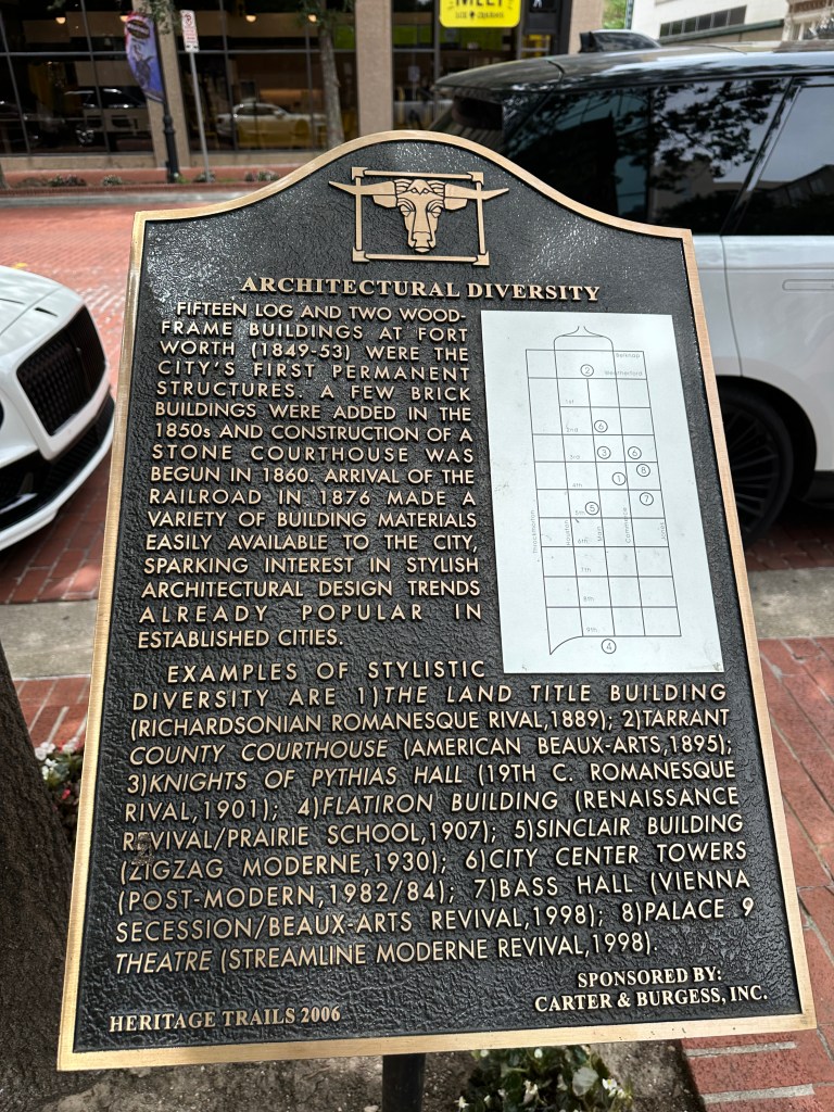 Upon further research when I got back home, the Heritage Trails is a series of 22 historical markers in Downtown Fort Worth that details Fort Worth’s rich history. I was able to take photos of eight of them that I immediately saw just walking around. Now, I will have to go back to get the rest of them.